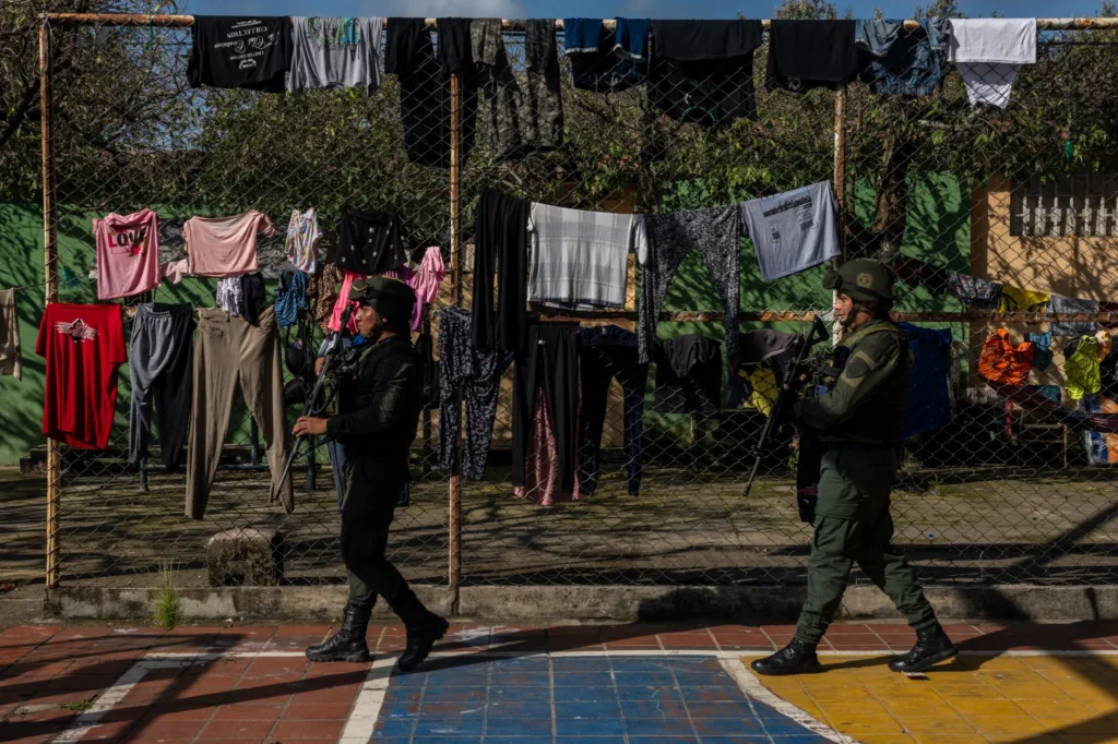 Policías patrullan junto a tendederos en Tibu, un pequeño pueblo colombiano en la frontera con Venezuela. Personas desplazadas por la violencia en la región se habían refugiado en el pueblo.Credit…Federico Rios para The New York Times