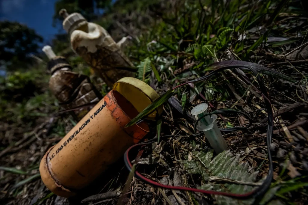 Minas terrestres fabricadas a mano por las FARC y colocadas en la cresta de una montaña que en tiempos del conflicto era un sendero muy transitado, en abril de 2015.Credit…Meridith Kohut para The New York Times